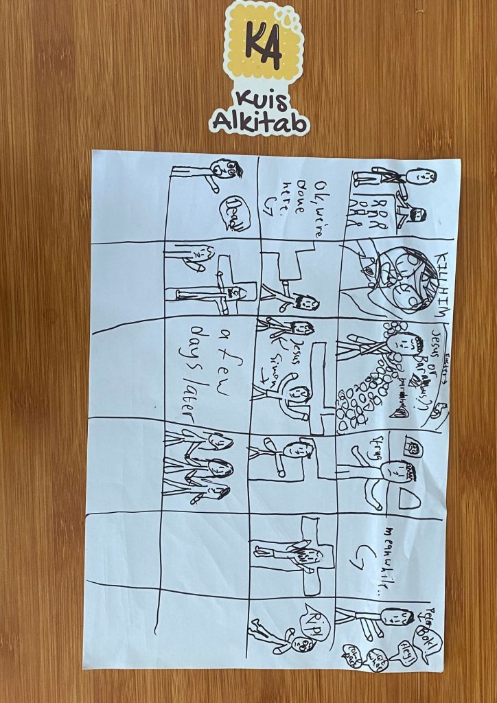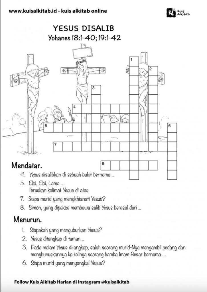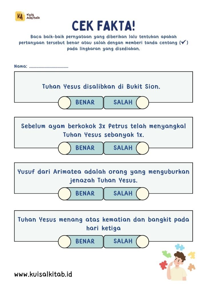 Melalui aktivitas ini, pengetahuan Alkitab anak tentang peristiwa kesengsaraan dan kebangkitan Yesus diuji.
