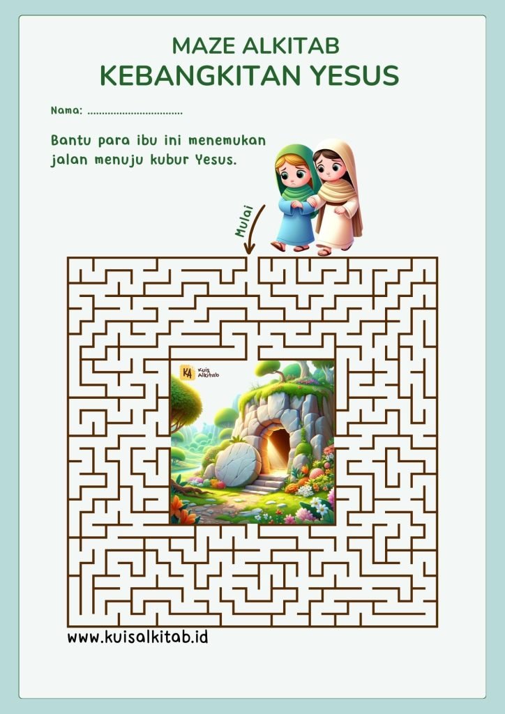 Temukan jalan menuju kubur Yesus! Maze dengan jalan memutar ini memiliki tingkat kesulitan sedang. Akan sangat cocok untuk kelompok usia 8-9 tahun.