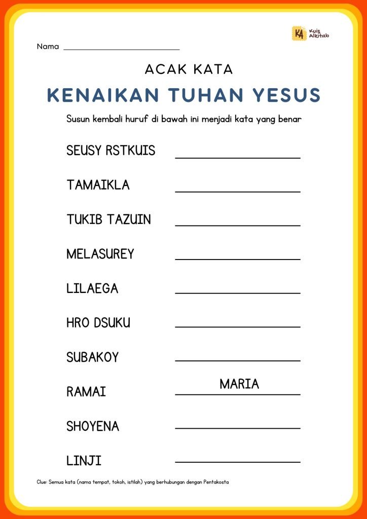 Semua tertulis di Alkitab. Minta anak-anak membaca Kisah Para Rasul 1:1-14. Untuk meningkatkan level kesulitan, minta mereka mengerjakan tanpa membuka Alkitab, baik sebelum maupun pada saat mengerjakan.
