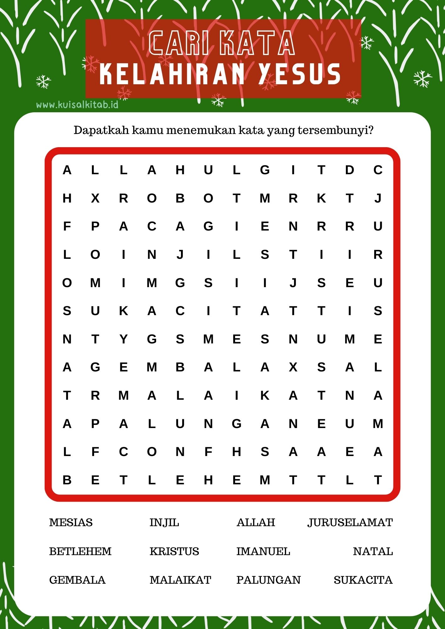 Kisah-kisah Natal biasanya mulai diceritakan ketika masuk bulan Desember. Kuis Alkitab punya materi aktivitas yang bisa digunakan untuk mengajar anak-anak Sekolah Minggu selama bulan Natal ini.